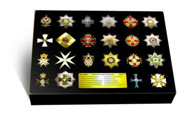 – 34 искусных копий орденов, с высокой детализацией, изготовленных из металла с горячими эмалями;